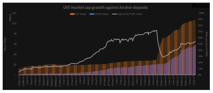随后不久,在 2020 年,UST 在 Terra 区块链上被公开宣布为一个“去中心化”的“稳定币”。然而,故事的第二个关键部分是,Terraform Labs 的一名工程师创建了 Anchor Protocol,这是一个在 Terra 上的货币市场,可以获得以 UST 支付的高一致性收益。Terraform Labs 的开发人员告诉 Do,他们将为 UST 设定 Anchor 的收益率为 3.6% 。在 Anchor 上线前一周,Do 告诉他们:“ 3.6% ?不,我们来设定为 20% ”。