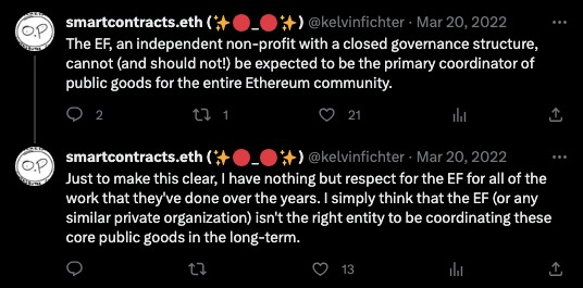 用 Kelvin Fichter 的话说, EF 是独立的非营利机构,拥有紧闭的治理结构,无法(也不应该)成为以太坊社区公共产品的主要协调者。