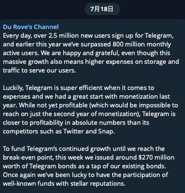Telegram 从 2021 年开始一共接受了两次外部资金,第一次是在 2021 年 3 月,Pavel宣布以出售债券的形式筹集了超过 10 亿美元。第二次是 2023 年 7 月,Pavel宣布为了维持运营,Telegram 发行了 2.7 亿美金的债券,Pavel 本人购买了其中的 25% 。在这次的信件中,Pavel 还透露了两个重要信息:Telegram 每日新增 250 万新用户;Pavel 本人不持有房产和私人飞机等富豪标配,只「拥有」Telegram、一些比特币和 Toncoin。