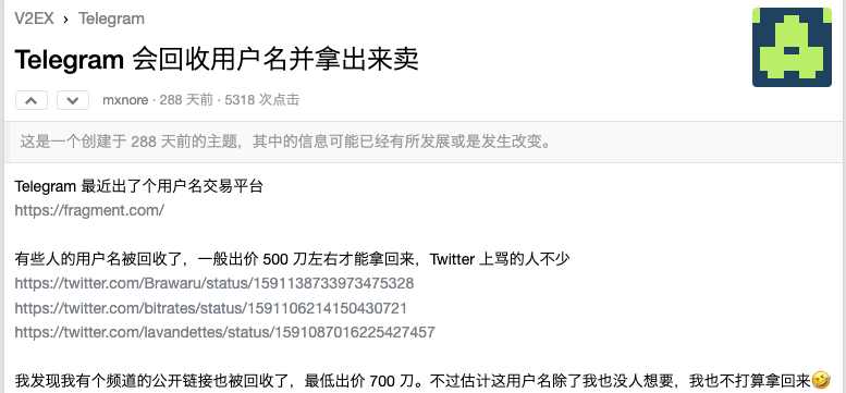根据来自Twitter和V2 EX 用户的消息,Telegram 将长期未登录以及一些用公告频道的精品用户名进行了无预警的回收。一名被回收用户名的用户曾表示,「没有人愿意为 Telegram 用户名支付约 160 美元」。但他显然低估了加密行业的热情,已经有多个用户名以超 200 万美元的价格出售。