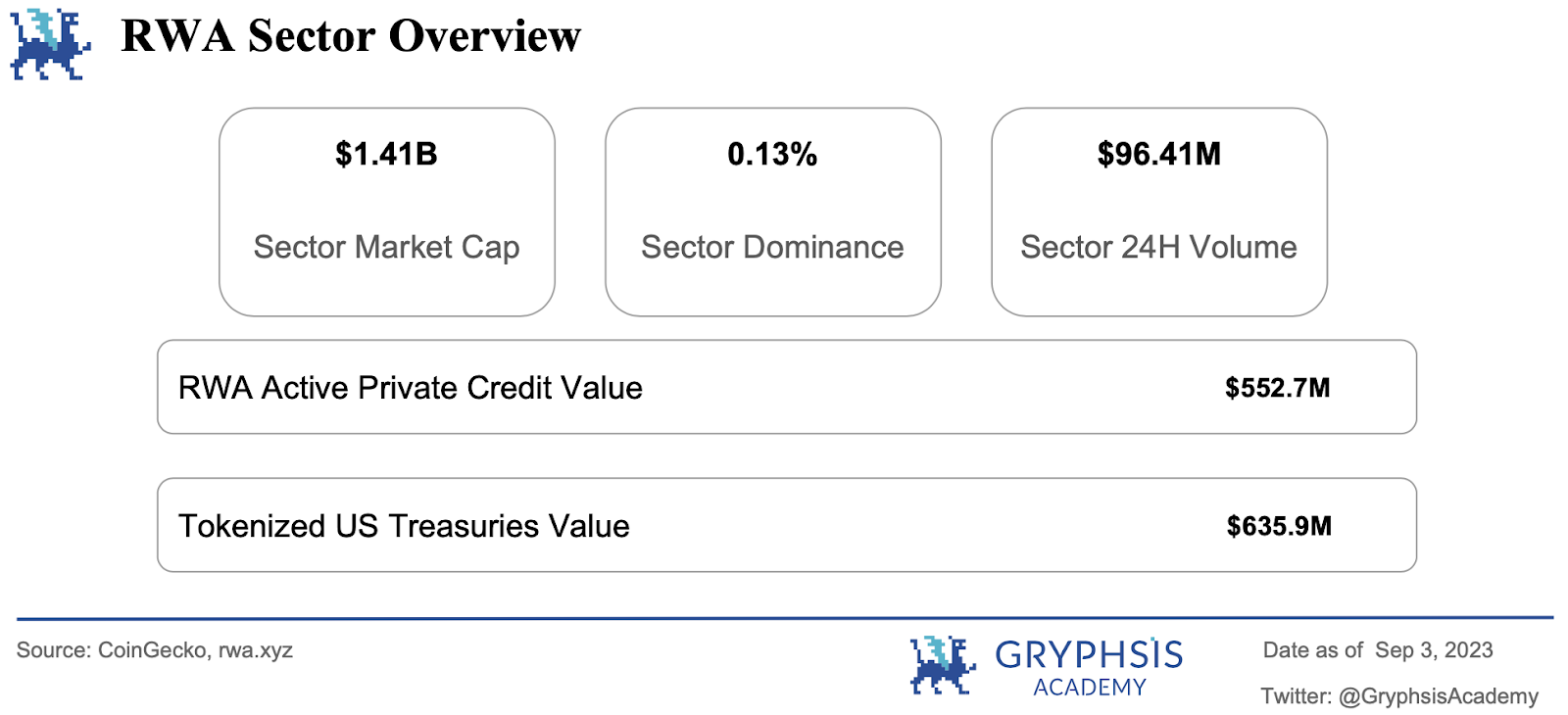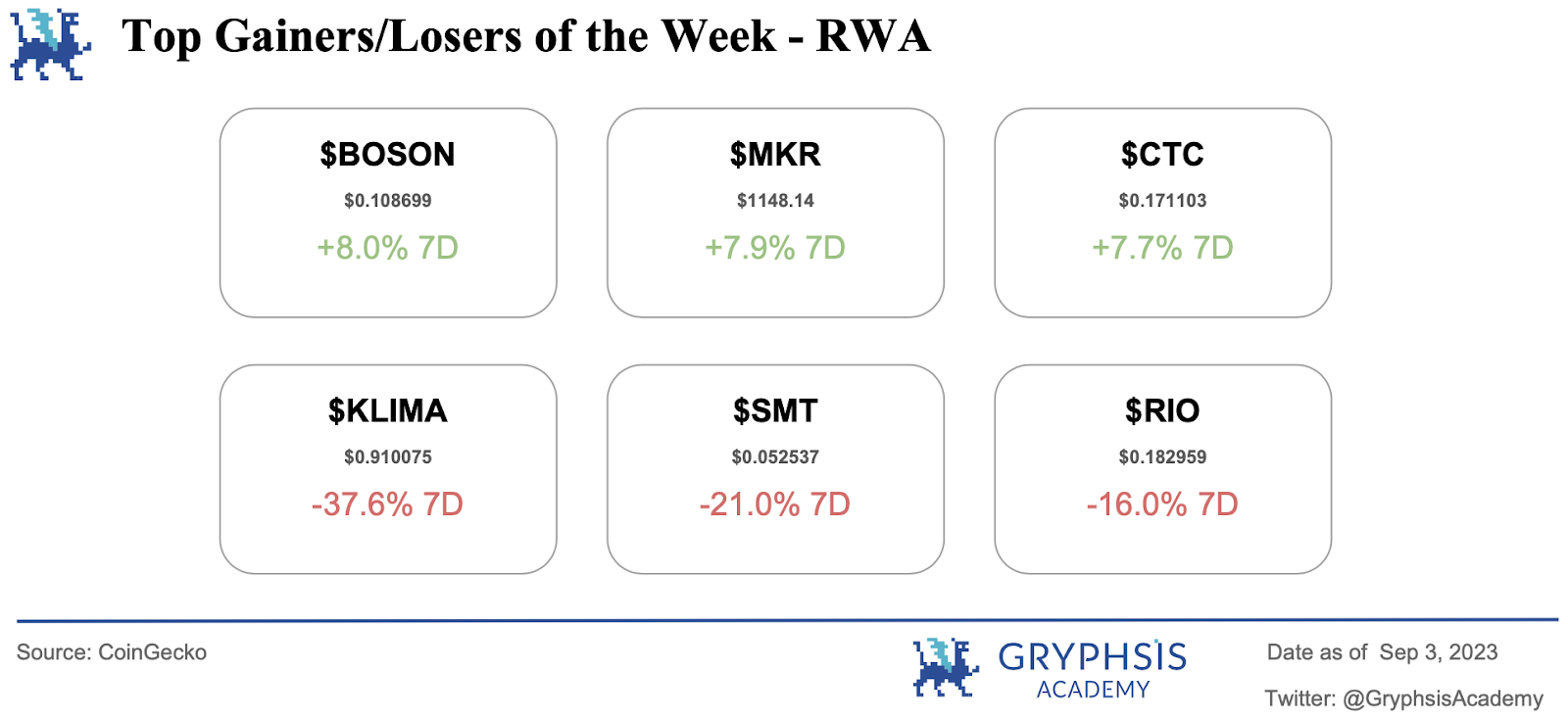 过去一周,现实世界资产(RWA)领域在市值和行业主导地位方面都略有上升。然而,在活跃贷款价值或代币化国库的总价值方面没有发生重大变化。本周的明星赢家包括 $BONSON、$MKR 和 $CTC,而 $KLIMA、$SMT 和 $RIO 出现了显著的下跌。