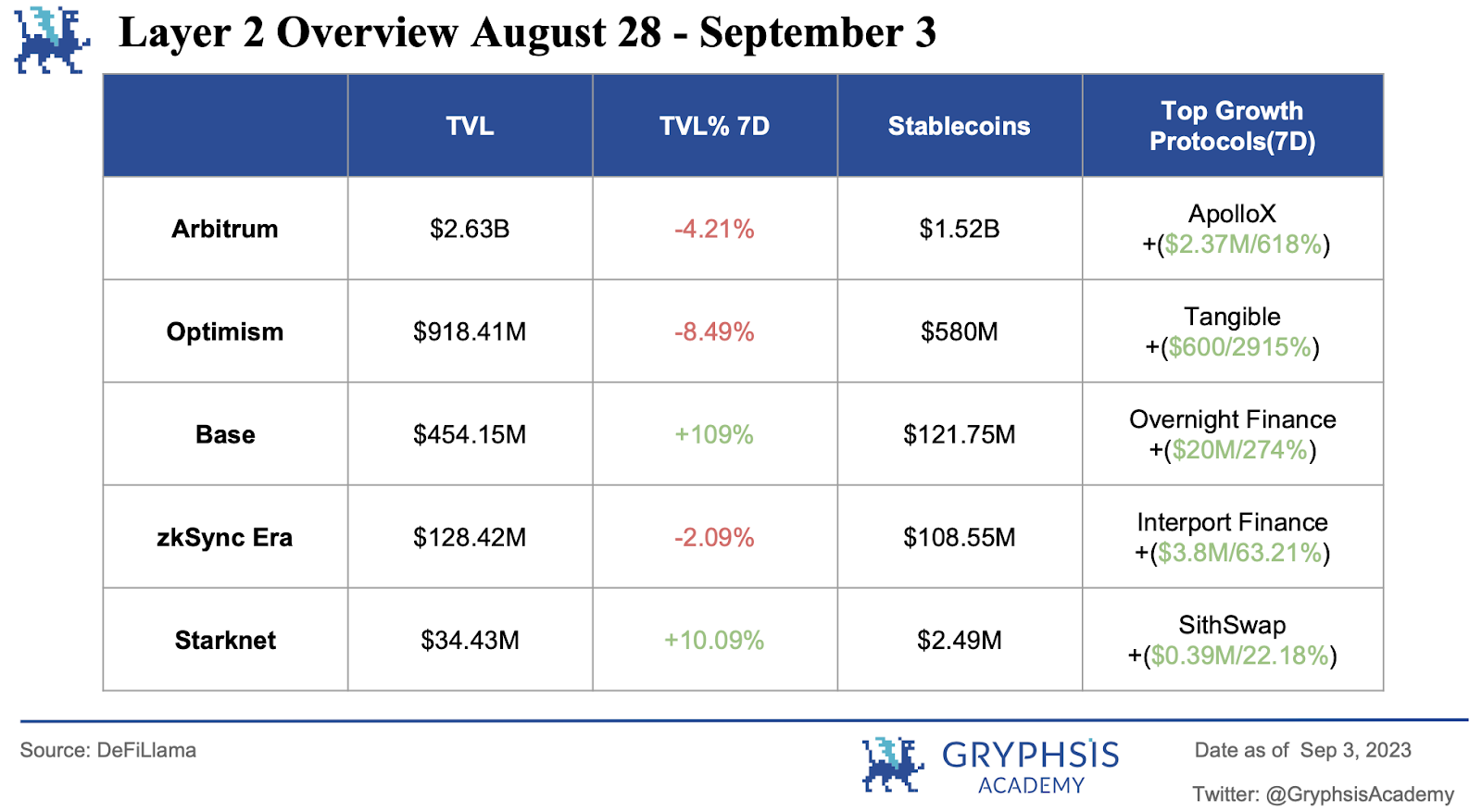 过去一周,在 Layer 2 领域中最值得注意的发展是 Base 持续显著的势头,其 7 天内总价值锁定(TVL)增长了 100% ,而其他大多数网络都呈下降趋势。在我们监控的 L2s 中,Optimism 的 TVL 下降最为显著,跌破了 10 亿美元。在协议方面,ApolloX、Tangible、Overnight Finance、Interport Finance 和 SithSwap 特别引人注目,因为他们的 TVL 显著增加。值得注意的是,Overnight Finance 和 SithSwap 曾出现在之前的最大赢家名单上,这暗示他们可能有持续的势头。