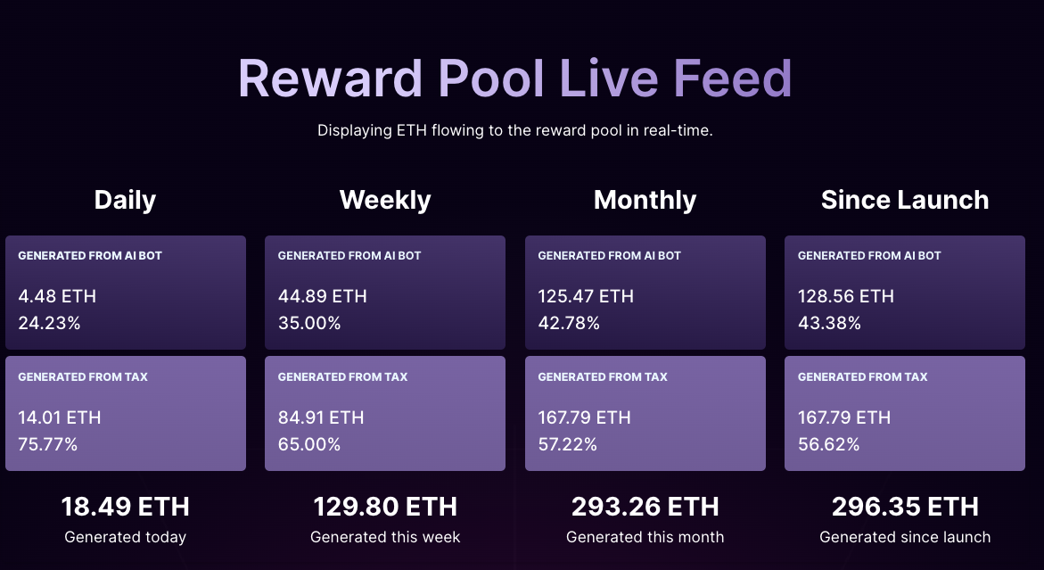 该协议在代币价格增值和利润生成能力方面表现出色。自从推出以来,代币价格在一个月内翻了三倍,并在过去的七天内取得了显著的 60% 增长。生成利润的能力强烈支持了代币价格的上涨。根据过去七天的移动平均数,AIMBOT 的年度持有者 APY 为 59% 。自该协议推出以来,它总共生成了 296.35 个 ETH 的利润。