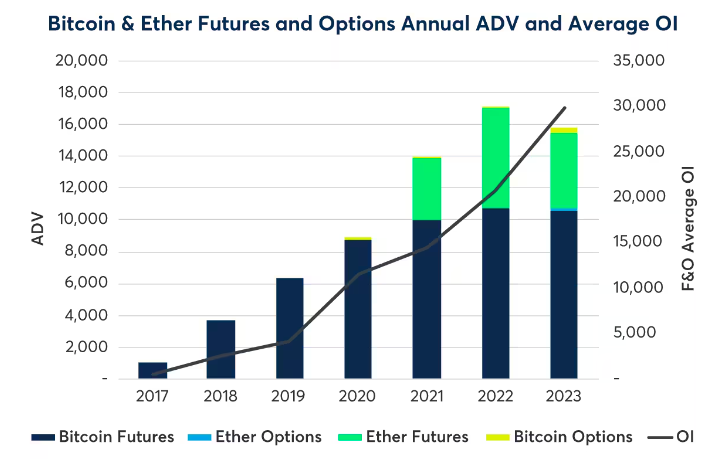而比特币和以太坊的未平仓合约也恢复接近到了 2022 年的水平。年初至 8 月期间,CME 比特币期货和期权的交易量同比增长了 154% ,而未平仓合约增长了 87% ,而比特币自今年年初以来也一直处于上涨的趋势,这表明传统市场的投资者对这两种加密货币的兴趣增加,部分程度上也能够显示出市场对比特币在未来一段时间内的看涨信心。