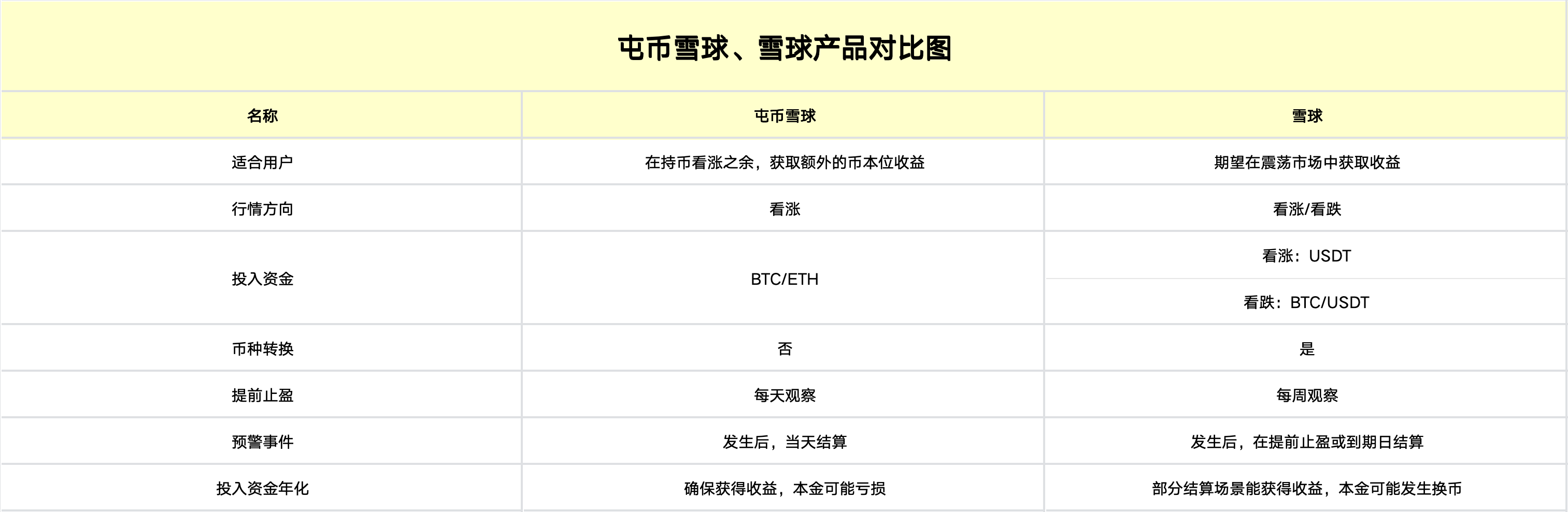 相比于 OKX 屯币雪球而言,OKX 原版雪球产品提供看跌选项,且年化更高,但用户的本金可能会转换为稳定币。