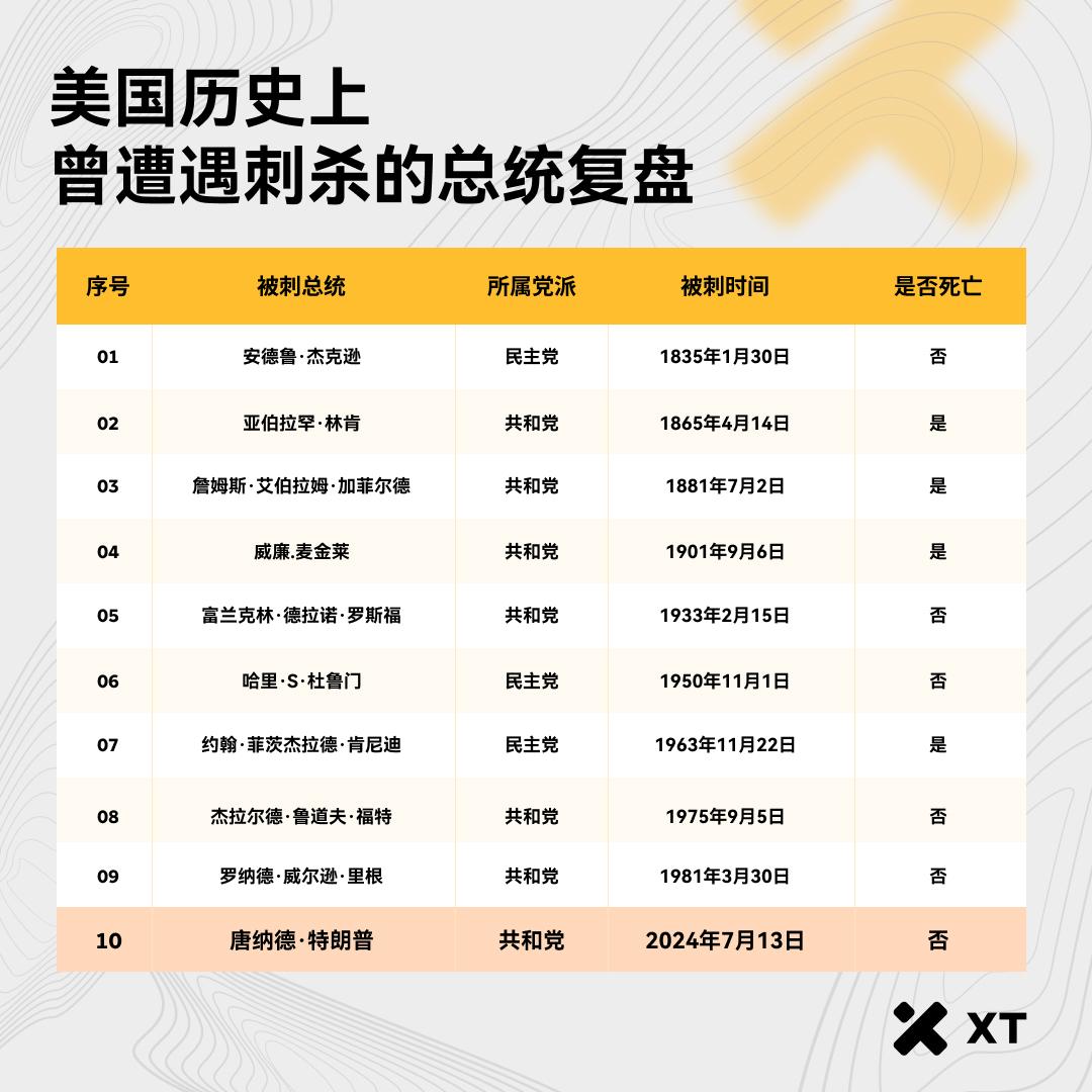 7 月 15 日,特朗普遇刺后的第一个交易日,美股全面上涨收盘创新高。政要遇刺事件往往与风险市场有说不清的关系,历史上共有十位美国总统遭暗杀,其中四位遇难。上一次刺杀美国总统事件发生在 43 年前的 1981 年,遭遇刺杀的里根总统也幸存下来。还有 1963 年第 35 任总统约翰肯尼迪,他是第四位被暗杀的美国总统。