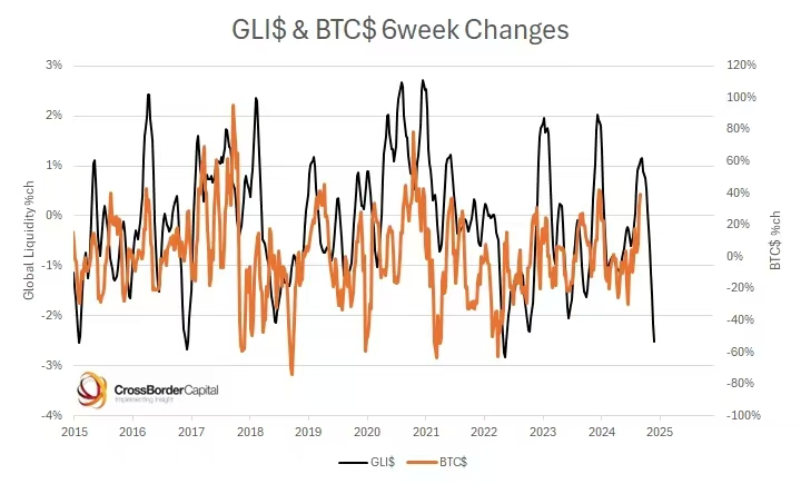 从权威宏观机构提供的数据中,我们可以找到一些答案:首先通过图一,我们可以看到 Global Liquidity Index(全球流动性指数)是比特币 6 周滚动回报率的领先指标。数据显示,GLI 的 6 周增长率往往能预测 BTC 价格的短期表现。通过观察流动性走势,我们可以预见未来 6 周内,流动性的回落可能会引发 BTC 价格的调整。另一家机构 Raoul 的研究数据也表明,未来 6-12 周内,流动性将持续回落。这种回落可能会引发 Crypto 市场进一步震荡。