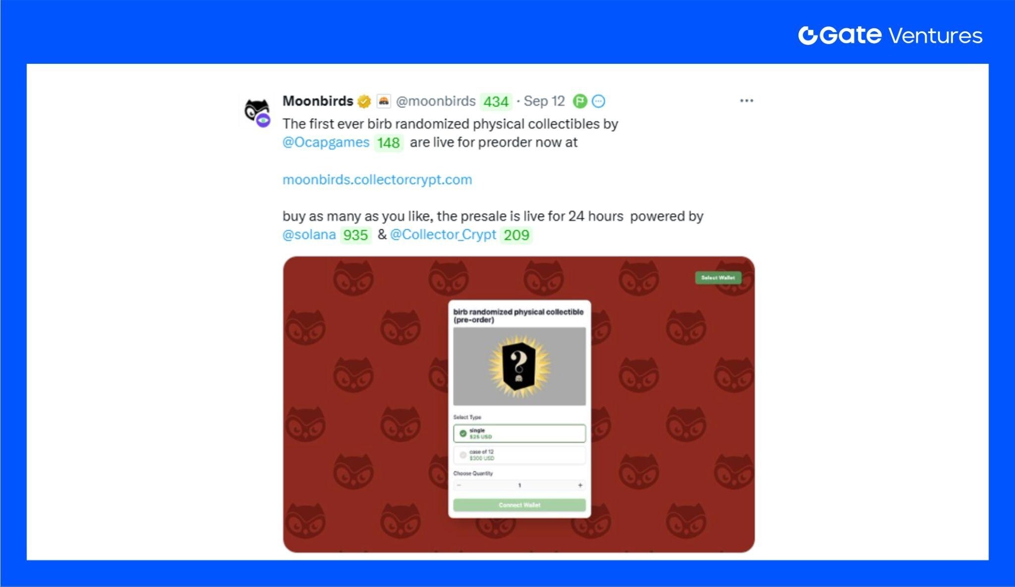目前 Collector 以宝可梦卡牌为主,但作为已具热度的链上 TCG 平台,其未来想象空间巨大。几乎所有类型的 TCG,包括 运动卡、其他动漫或电影 IP,都可像宝可梦一样完成上链售卖。近期平台还将与 Web 3 知名 NFT 项目 Moonbirds 合作,推出实体收藏品,并在 Collector 上发行对应的链上凭证。