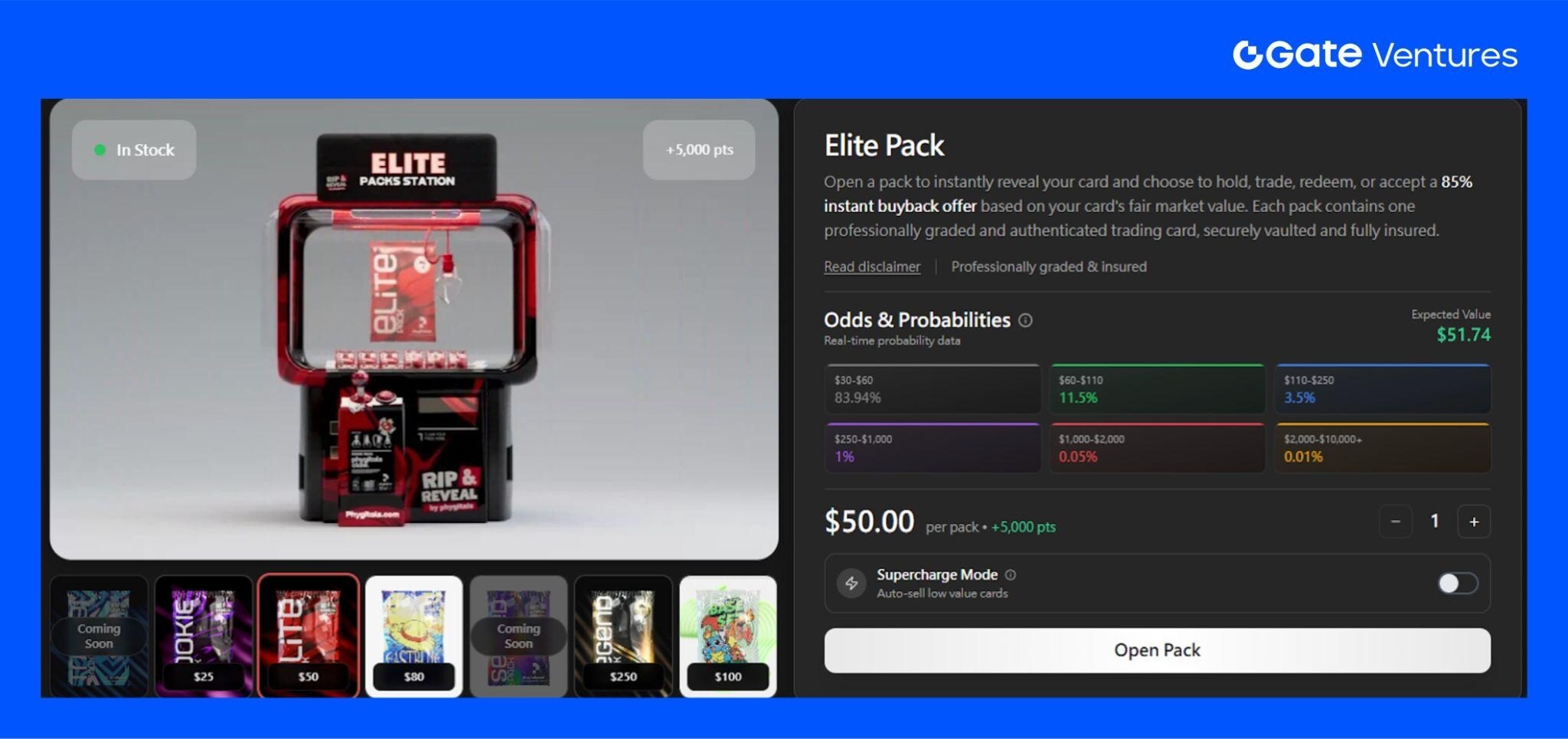 Phygitals 与 Collector 模式相似,核心玩法是购买卡包并开出不同价值的卡牌。用户可选择 持有、二级市场交易,或以市场价约 85 折回售给平台。卡包定价区间包括 25 美元、50 美元、80 美元、250 美元和 500 美元,不同价位对应的稀有度与潜在价值各不相同。除宝可梦卡牌 外,平台还引入了 One Piece 等其他热门 IP,拓展了收藏品种类与受众基础。