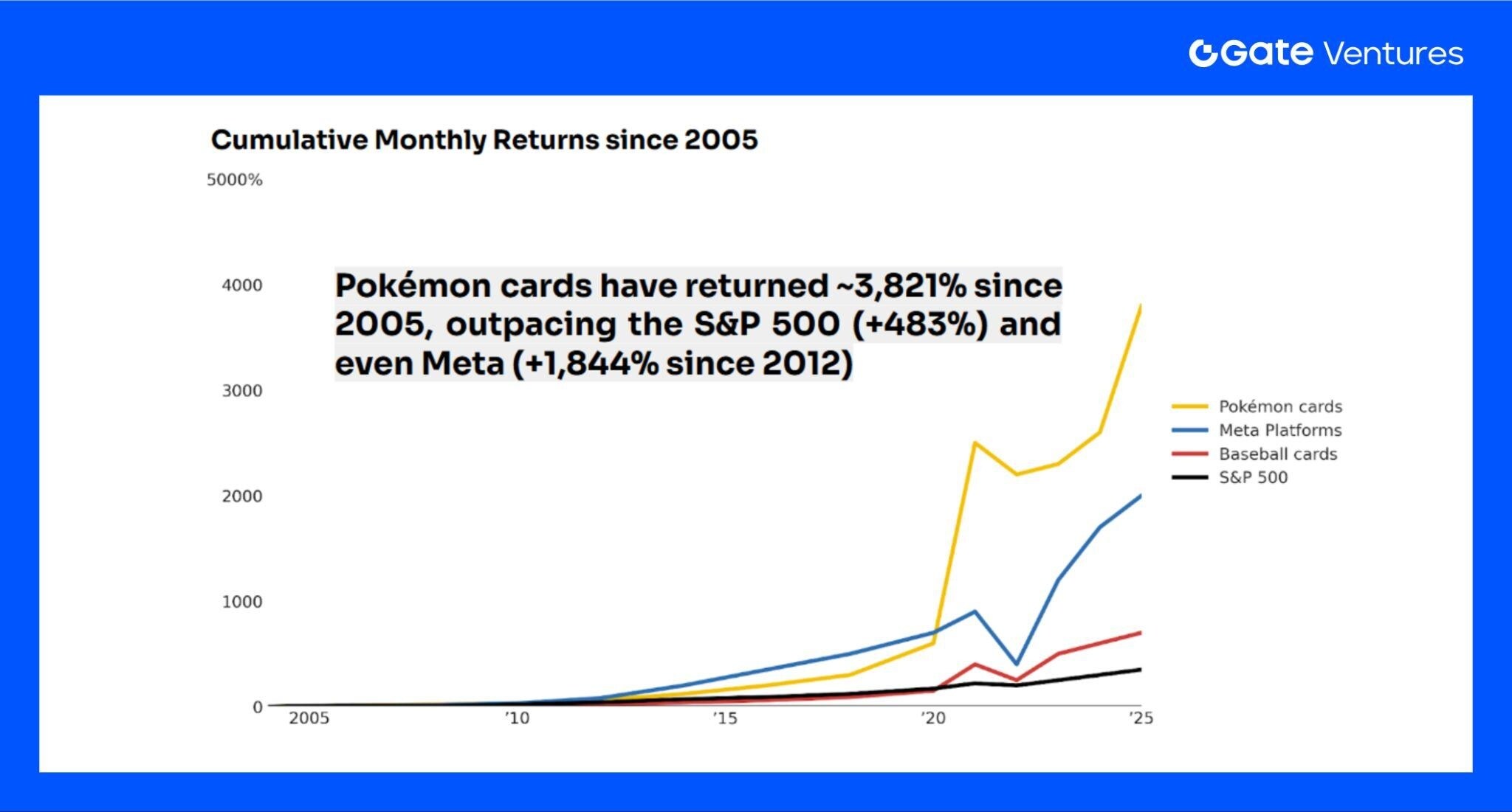 随着线上交易平台的发展、社交媒体的传播以及跨文化粉丝群体的壮大,宝可梦卡牌正在从单纯的娱乐消费品,逐步演变为兼具收藏与投资属性的全球化资产,从而进一步巩固其在 TCG 生态中的核心地位。宝可梦卡牌的投资价值长期被低估,但数据显示,其过去 20 年的回报率甚至超过了 S&P 500 和 Meta,充分彰显了其独特的投资属性。