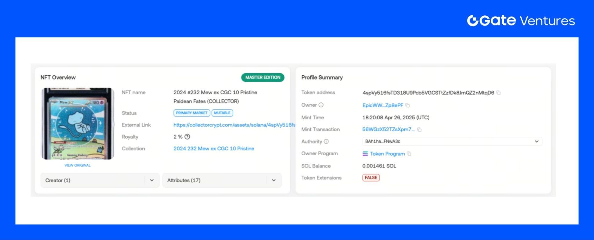 :每张卡牌在铸造成真实稀有度与可信验证NFT 后,都会在区块链上留下永久记录,包括稀有度与真伪信息,实现所有权的链上确权与全球化自由流通。NFT 作为数字所有权凭证,对应唯一的 Token Address,并附带铸造时间戳与完整的交易历史,确保卡牌的真实性与可追溯性。