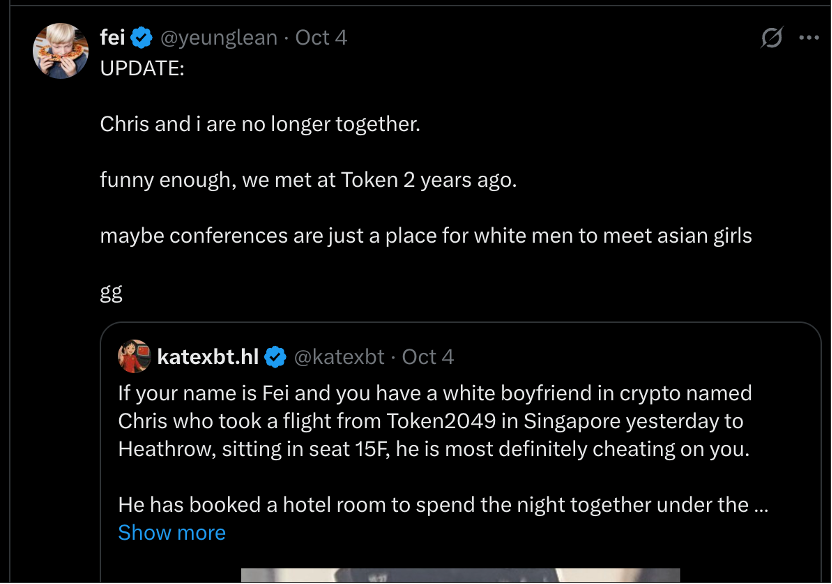更戏剧性的是,Chris 的女友 Fei (@yeunglean) 当天就看到了这条帖子。同天,她发布分手声明:"更新:Chris 和我刚分手了。有趣的是,我们两年前在 Token 头一次认识;也许行业会议只是白男认识亚洲女孩的地方。gg(游戏结束)。"