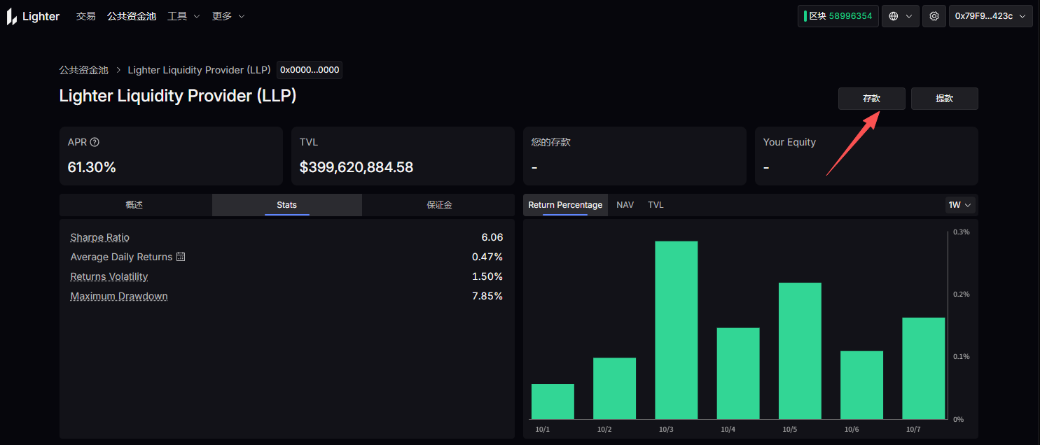 STEP 2. 点击“公共资金池”后选择 LLP,存入资金,即可开始交易赚积分。
