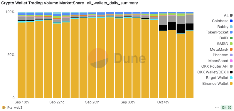币安钱包于去年末推出,刚刚上线时饱受争议,而自币安 Alpha 上线后,如今币安钱包无论是交易量、用户活跃度都已经稳居加密钱包第一的位置,根据 Dune 数据,币安钱包已占据了加密钱包市场 90%的份额。