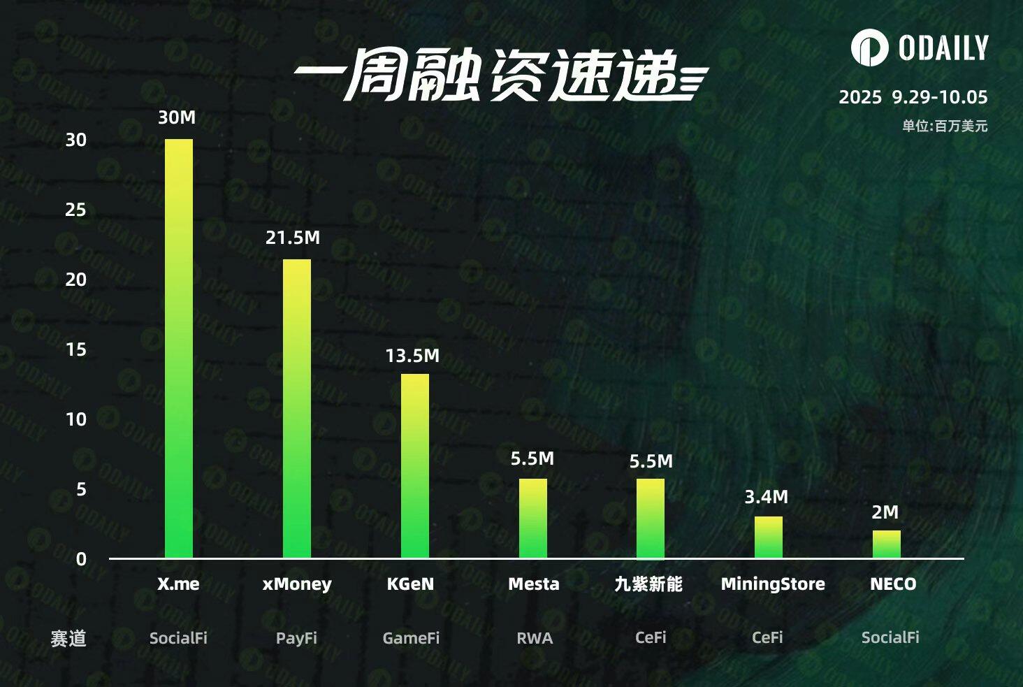 根据 Odaily 星球日报的不完全统计,2025 年 9 月 29 日至 10 月 5 日,全球区块链领域共披露 7 起融资事件,相较前一周的 16 起有较大减少,融资总额达 8140万美元,较前一周的 4.43 亿美元锐减。尽管如此,本周融资数据却是回归到正常水平。