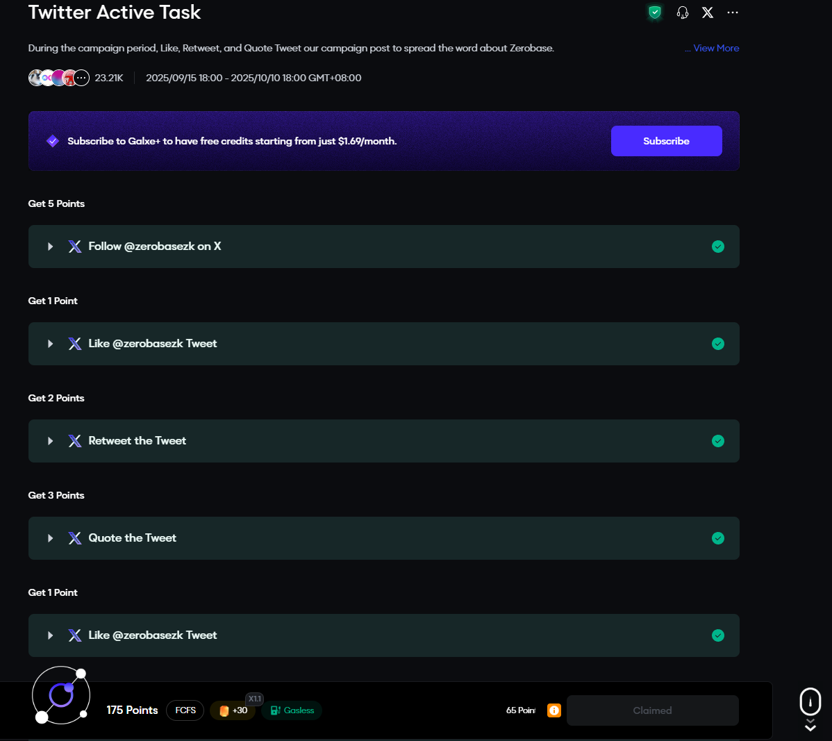Galxe 上的任务将于今晚 6 点截止。作为活动福利的一部分,Zerobase 将在活动最后一天为所有参与者承担所需的 Gas 费用,以确保积分的顺利领取和兑换,目前正是最后的“撸毛”机会,抓住机会就是赚到。