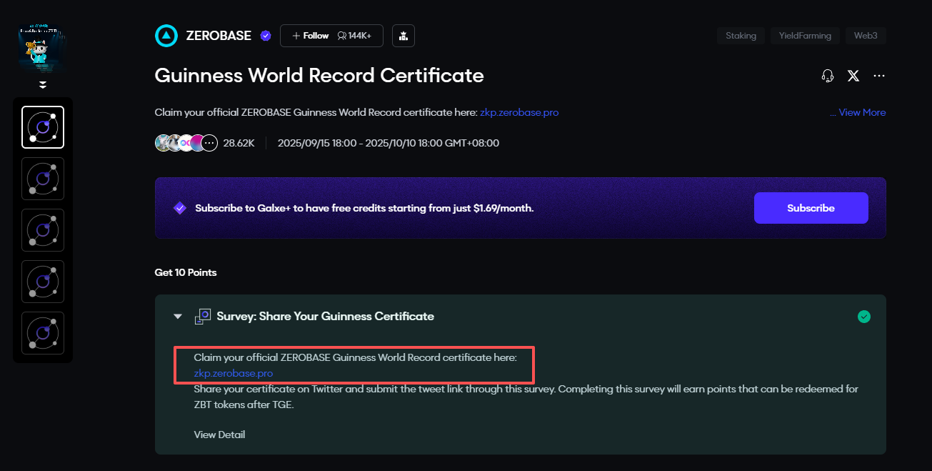 任务 1:根据要求领取 Zerobase 官方吉尼斯世界纪录证书并发布至 X 账号,易完成,共 10 积分。