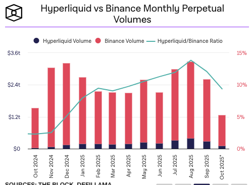 而在同一天,全球最大的交易所币安却因技术问题陷入部分系统故障,但这实际并不能说明目前的 Hyperliquid 已经比币安性能更高,因为双方面对的系统压力并不同,在 10 月 11 日,Hyperliquid 的永续合约交易量超 100 亿美元,而币安的交易量是其 10 倍以上。The Block 数据 显示,9 月份 Hyperliquid 的合约交易量为 2824.7 亿美元,而币安的合约交易量为 2.34 万亿美元,Hyperliquid 的合约交易量仅为币安的 12%。