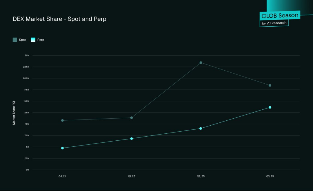 • 现货市场:DEX 的市场份额从 2024 年第四季度的 10.5%,上升至 2025 年第三季度末的 19%。