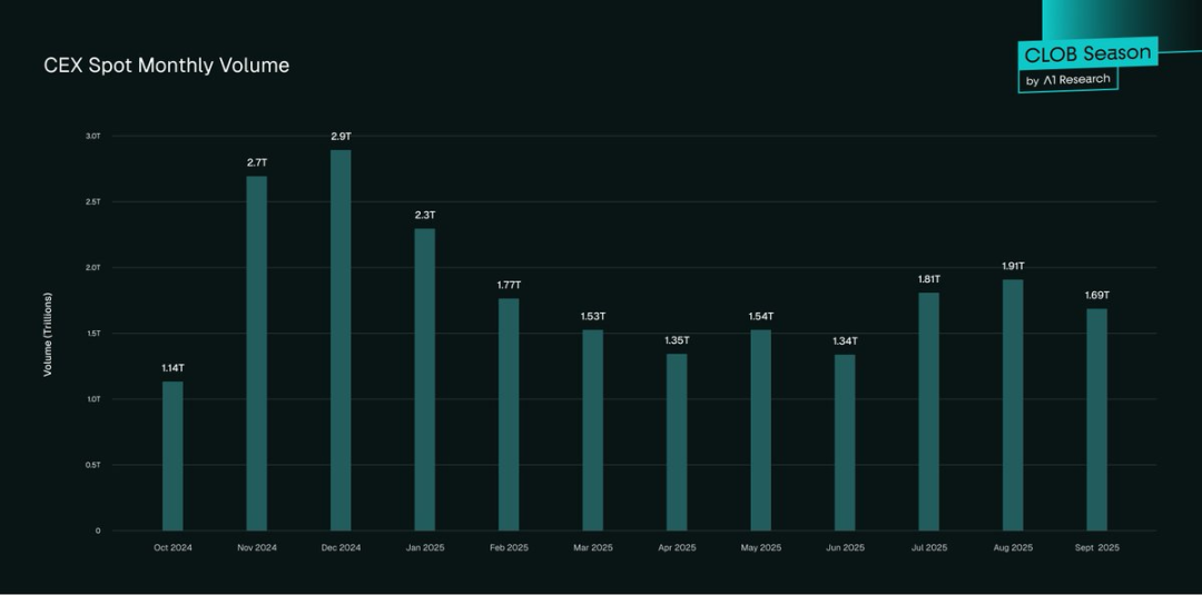 • CEX 表现:2025 年第三季度,CEX 现货交易量估计超 5.4 万亿美元,仍保持主导地位,较 2025 年第二季度增长 25%。