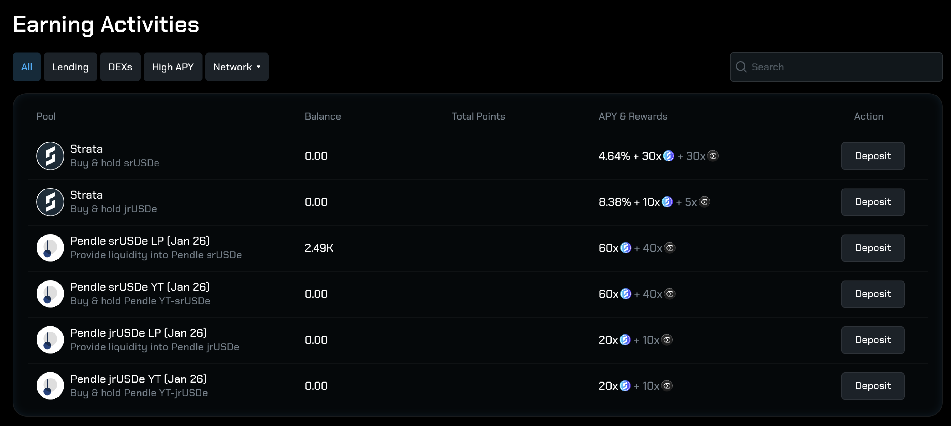 当前,srUSDe 的年化暂报 4.64%(外加 30 倍 Strata 积分和 30 倍 Ethena 积分),jrUSDe 的年化暂报 8.38%(外加 10 倍 Strata 积分和 5 倍 Ethena 积分)。如果想获取更高的积分效率,则推荐选择 Pendle srUSDe LP,当前年化暂报 7.96%,外加 60 倍 Strata 积分和 40 倍 Ethena 积分。