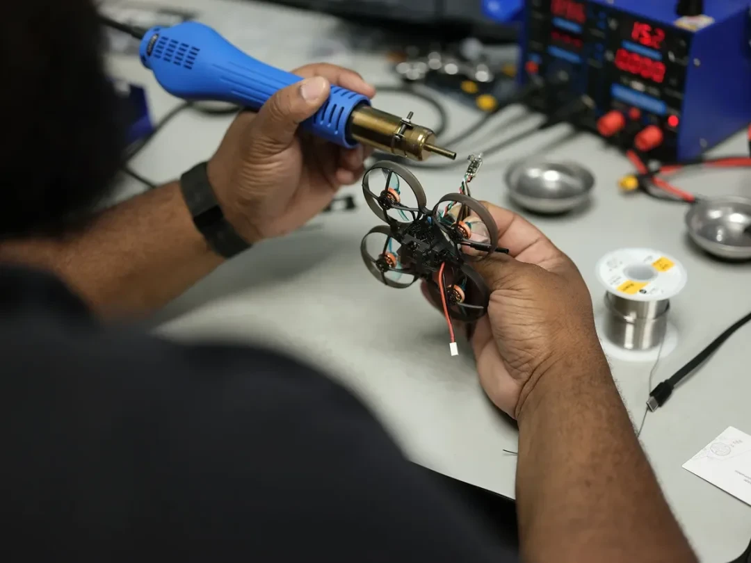 一名工人在 Unusual Machines 公司组装无人机零件