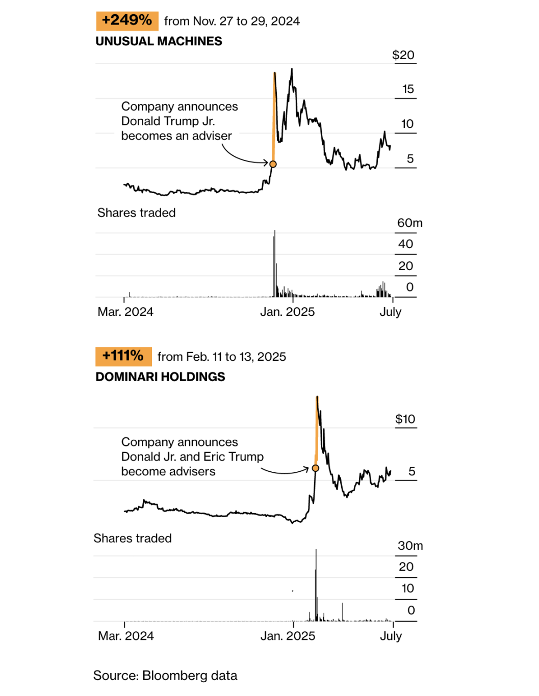 当特朗普的儿子成为顾问时,Unusual Machines、Dominari Holdings 股价飙升