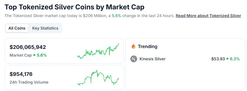 Coingecko 数据显示,随着现货白银突破 53 美元/盎司再创历史新高,代币化白银板块市值已突破 2 亿美元,现报 206,065,942 美元,24 H 涨幅 5.6%。