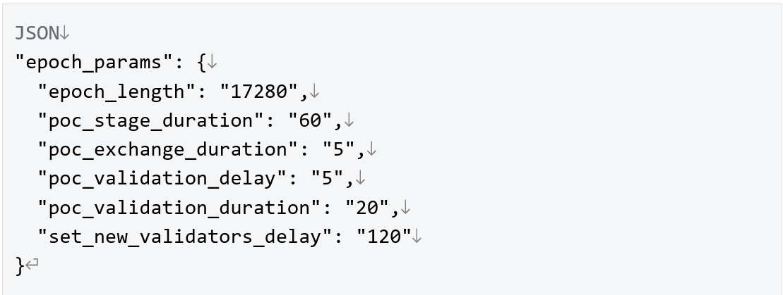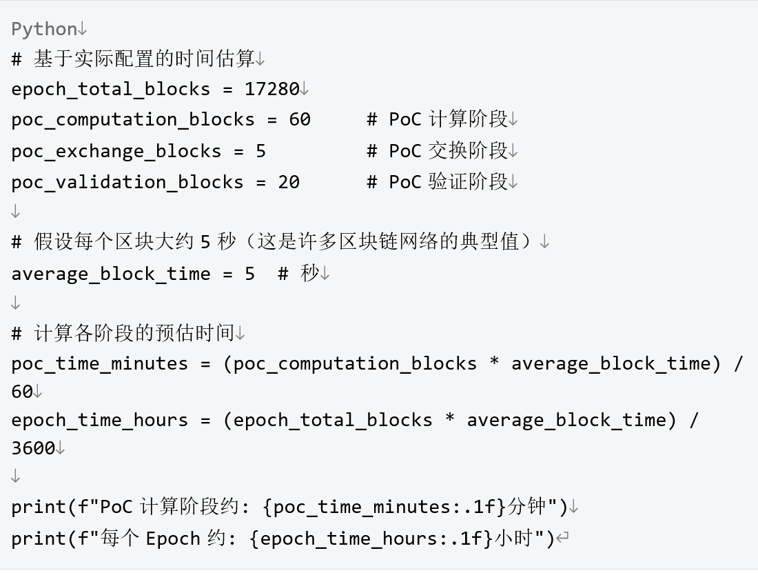 Gonka 采用基于区块高度的 Epoch 管理机制,每个Epoch的长度以区块数为单位计算。根据实际的网络配置: