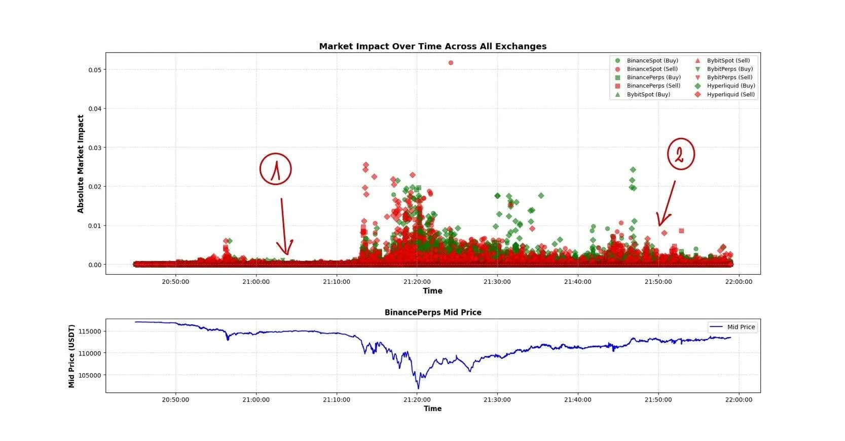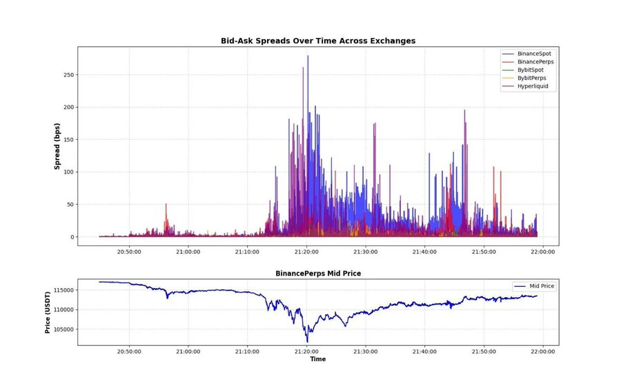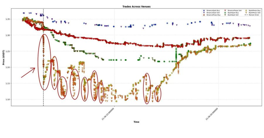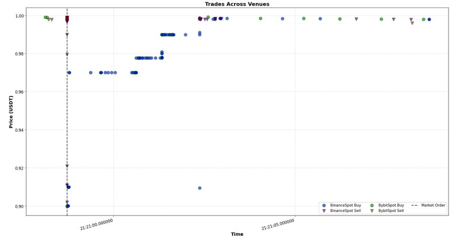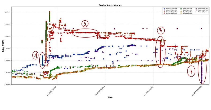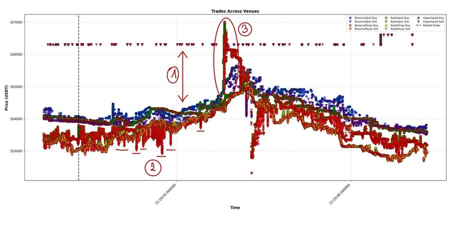 最后,(3)与(4)这两种情况可能相互关联。在币安永续上出现了一笔大额市价卖单,随后几乎以相同规模传播至 HyperLiquid,再次实现跨平台的价格平衡。