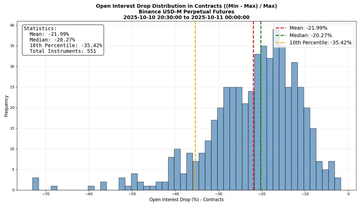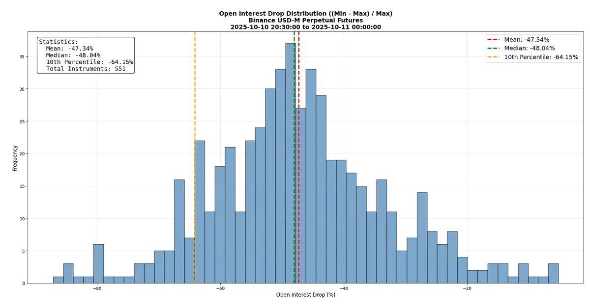 这次下跌几乎彻底摧毁了市场结构。从下图可以看到,Binance 永续合约的未平仓量平均下降接近 50%。超过 50 个交易品种的未平仓量跌幅超过 64%。这意味着:在崩盘期间,超过一半的合约被关闭——无论是通过强平、ADL 还是手动平仓。未平仓量可以近似理解为市场规模,因此我们可以说:市场在那一天平均缩水约 50%。