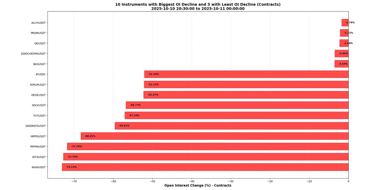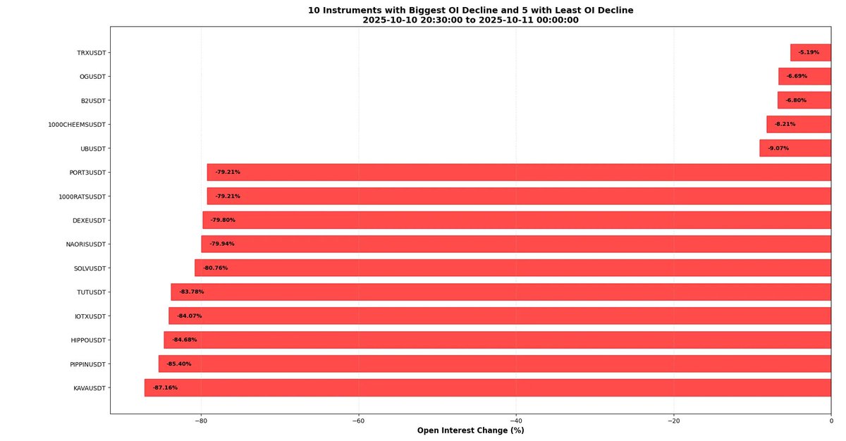 一些品种的未平仓量甚至减少了 80%。也就是说,不到五分之一的合约“幸存”——这个数字在任何标准下都极端得惊人。下表列出了极端案例:KAVA 以近 90%未平持仓量坍塌“荣登”耻辱榜,而 TRX 几乎没动,仅下降约 5%。这清楚反映了部分市场的高杠杆状态,以及去杠杆过程的残酷性。