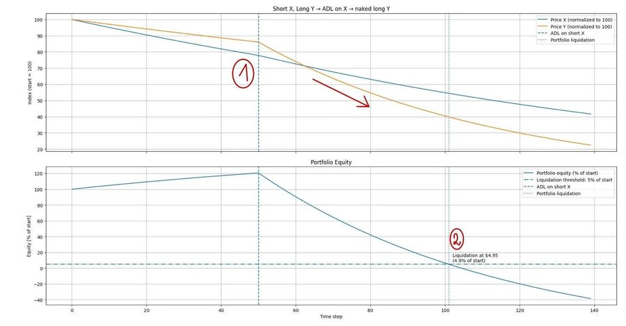 你打开电脑,发现市场突然暴跌。从图表上看,X(空头)下跌速度明显快于 Y(多头)——你暗自高兴,以为这波赚定了。但你没看到的是:由于过度杠杆,你的交易所已经通过自动减仓机制(ADL)强制平掉了你的空头仓位。结果,你此刻实际上只剩下一个“裸多”头寸。当市场继续下跌时,你的多头 Y 不再受到空头 X 的对冲保护,你的权益开始随价格同步下滑。很快,你被系统强制平仓——而你此刻可能还在庆幸自己的策略“理论上”表现不错。