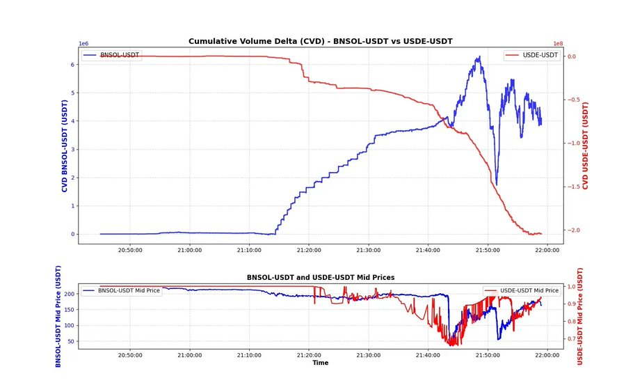 一个更让人意外的发现:看看 USDE 与 BNSOL 的 CVD(累计成交量差)。USDE 的 CVD 并不异常——约 2 亿美元的卖压虽然不小,但大部分出现在下跌之后(很可能是由激进套利者撮合的可成交限价单)。