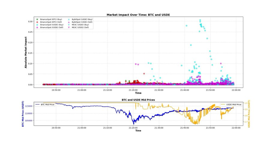 我们可能永远无法知道真相,但从数据推断,这种解释最为合理。我们可以进一步深入——像 X 上的讨论那样,逐秒对比这三种资产,寻找更深层次的模式。目前我只想查看基本数据,看是否有任何一眼可见的线索。我认为,BTC 触底与 USDE 触底之间的时间差,以及 CVD 曲线形态,能够为我们理解当时的市场机制提供一些背景。