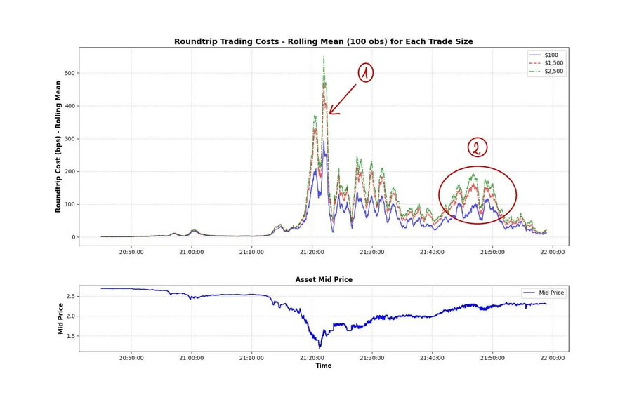另一个有趣的例子是 ASTER。图中的箭头标出了一个瞬时冲击超过 10% 的大额市价单。市场被严重扰动,价格一度比公允价值低了数个百分点,每隔 500–1000 毫秒就有新的大额市价单成交。几秒钟后,市场才逐步回到均衡状态。