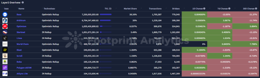 - Base 和 Arbitrum 分别以 38.26% 和 35% 的市场份额占据前排,本周 Base 依然在以太坊 Layer 2 的 TVL 中位居第一。