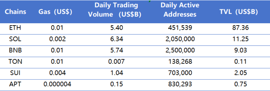 主要从日交易量、日活跃地址、交易费用分析目前主要 Layer 1 含 ETH、SOL、BNB、TON、SUI 以及 APT 的相关数据。