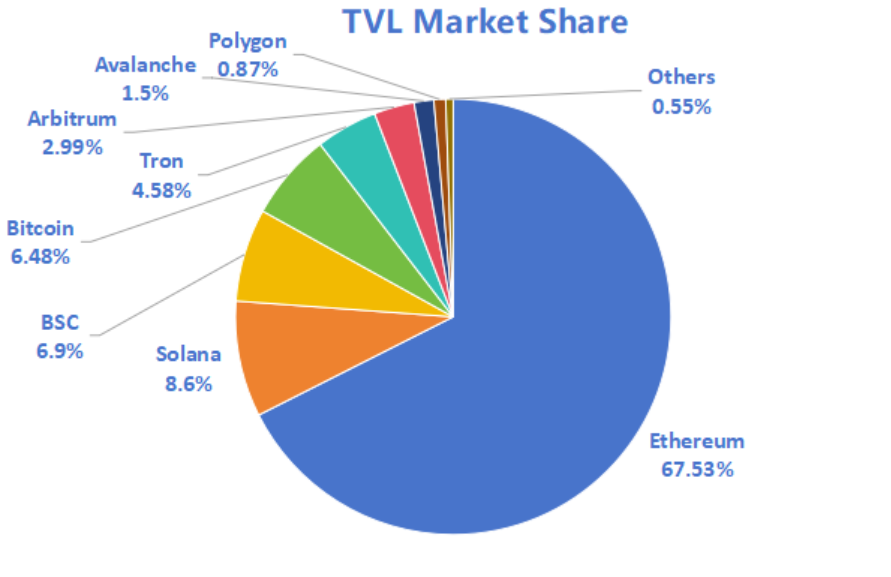 按公链进行划分,其中 TVL 最高的三条公链分别是 Ethereum 链占比 67.53%;Solana 链占比 8.6%;BNBChain 占比 6.9%。