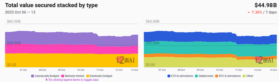 ● 据 L 2 Beat 数据显示,以太坊 Layer 2总 TVL 为 449.8 亿美元,本周较上周 478.8 亿美元,整体跌幅为 7.36%。