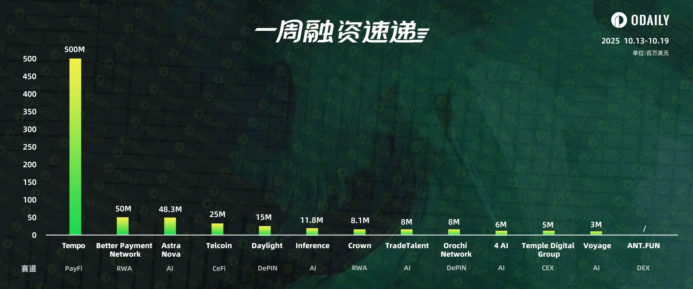 本周单笔融资规模最大的为专注于支付的区块链项目 Tempo 宣布完成 5 亿美元 A 轮融资,其次则是可编程支付网络 Better Payment Network(BPN)完成 5000 万美元融资。