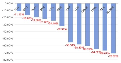 在10.11的极端行情中,主流资产几乎无一幸免。BTC、ETH等主导性资产均录得两位数跌幅,市值排名前二十的币种普遍出现深度回调。然而,在这片“血海”中,TRX的表现格外出众。