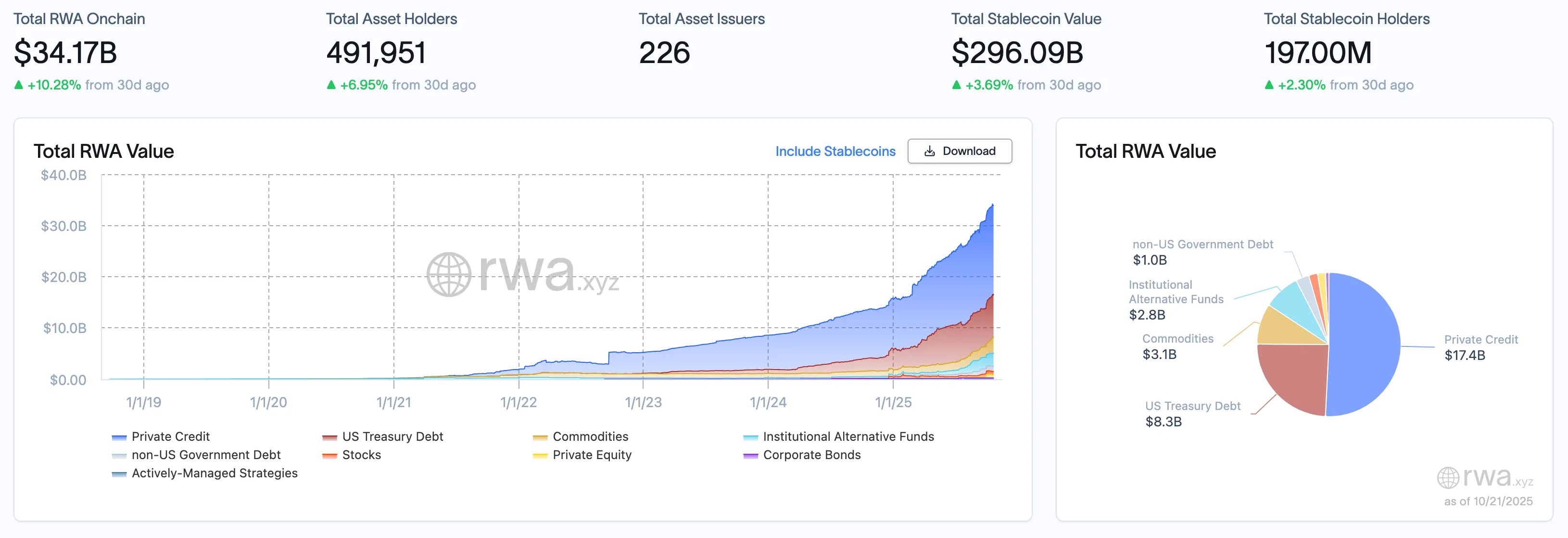 截至 2025 年 10 月 21 日,RWA 链上总价值达 341.7 亿美元,较 10 月 14 日的 338.4 亿美元增加 3.3 亿美元,涨幅为 0.98%。RWA 总市值延续此前温和上涨态势,维持在历史高位区间运行,在短期波动中仍显示出持续的韧性。资产持有者总数从 482,446 人上升至 491,951 人,一周新增 9,505 人,增幅为 1.97%。资产发行人数量从 224 个增加至 226 个,新增 2 个。稳定币市场方面,总市值从 2938.4 亿美元上升至 2960.9 亿美元,增长 22.5 亿美元,涨幅为 0.77%,为连续一周下跌后的反弹修复。稳定币持有者数量从 1.9588 亿人增长至 1.9700 亿人,增加约 112 万人,增幅为 0.57%。