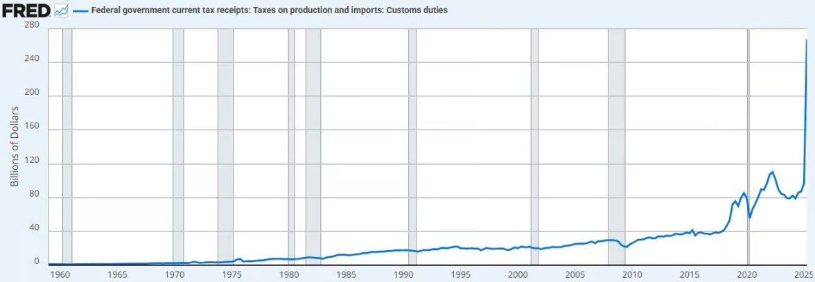 预期关税收入:假设关税税率为 13%,预计每年可增加 3800 亿美元关税收入。下图展示了截至目前关税带来的影响。