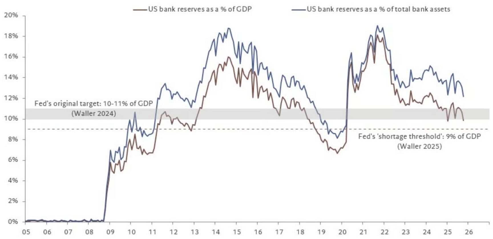 随着这些因素发酵,银行准备金正接近美联储设定的短缺水平。