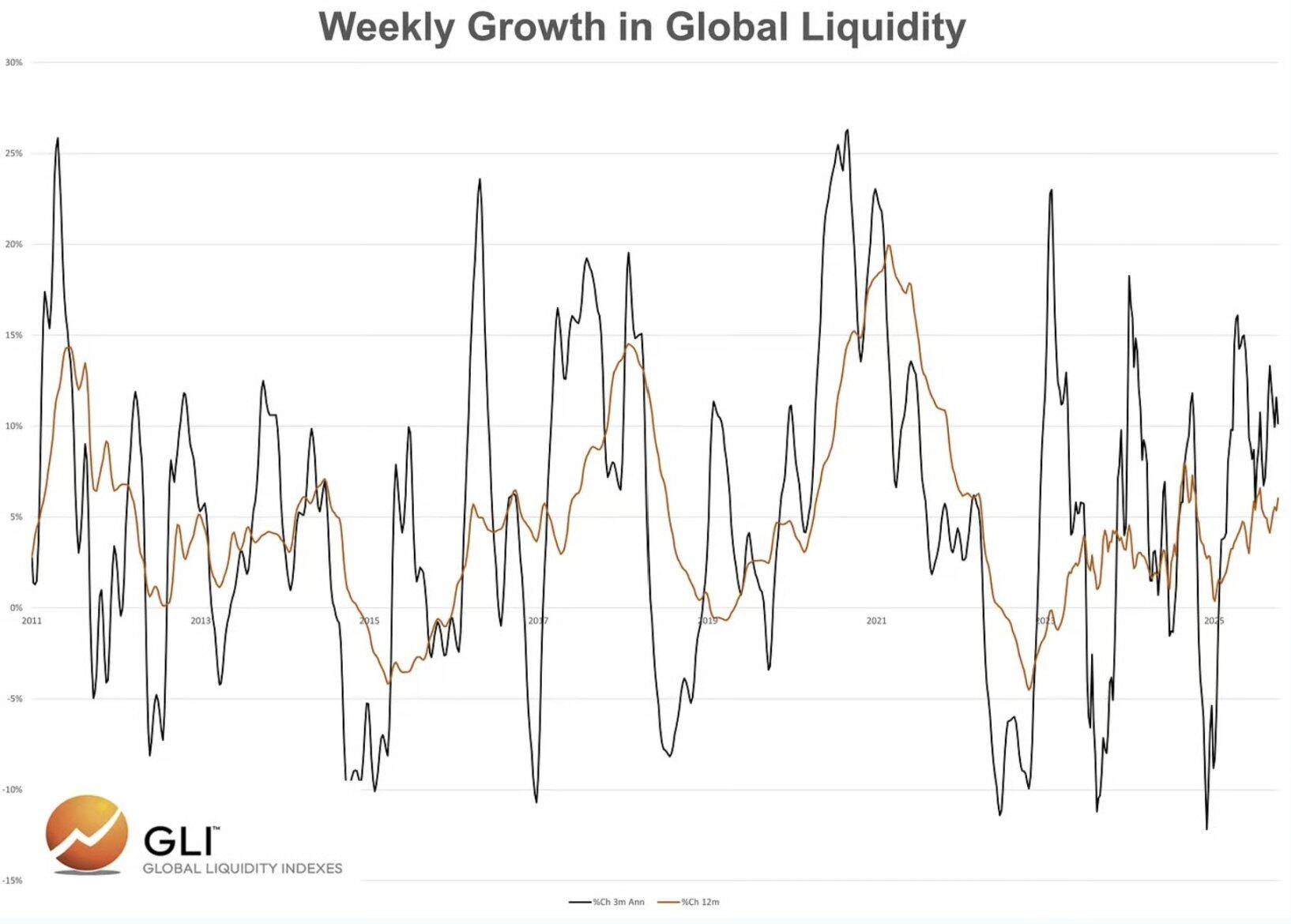 - 全球流动性年增长率目前为 6%。