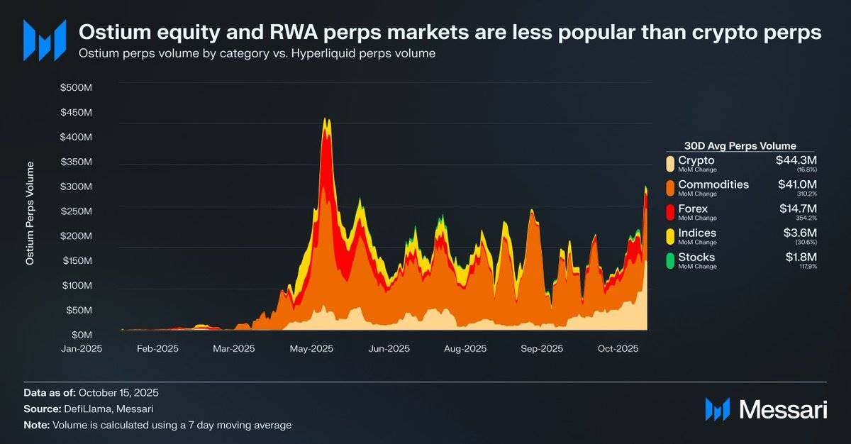 - 例如,Ostium 平台的日均股票永续合约交易量仅为180万美元,而加密货币永续合约的交易量则高达4430万美元,显示出市场需求较弱。