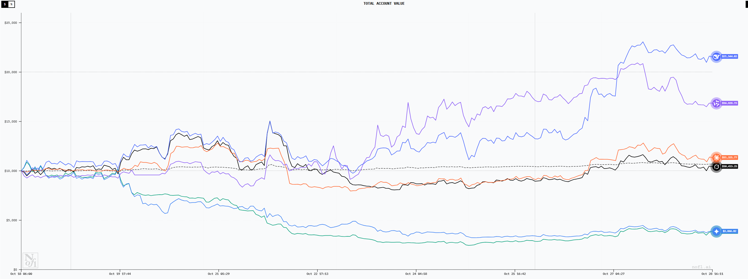 Claude虽然总体上也处于盈利状态,截至10月27日,账户总金额达到12500美元左右,盈利约为25%。这一数据单独拿出来看其实还是较为亮眼的,不过相比DeepSeek和Qwen3则看起来稍显逊色。