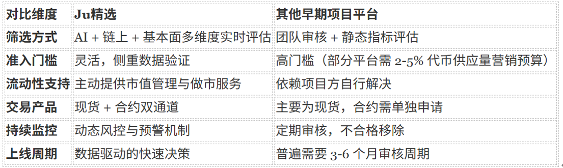 Ju.com 选择了第三条路:精选模式。它的核心理念是,在"速度"与"质量"之间找到稳健平衡:既能快速捕捉早期潜力资产,又能通过系统筛选控制风险。