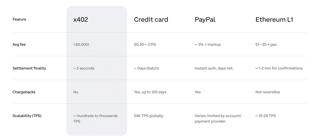 相较于传统支付方案(如银行卡、Stripe、PayPal、或 OpenAI 预付积分制),x402 的结构更接近互联网底层标准,